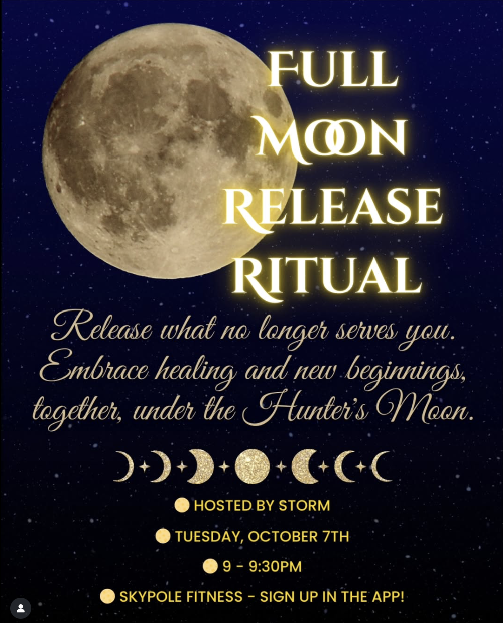 On the night of the Hunter’s Moon, we gather in sacred space (SkyPole Fitness ) to honor the full moon’s fierce and magnetic energy. The Full Moon Release Ritual is designed to help you shed what no longer serves and step into your untamed power. We will harness the full moon’s powerful, culminating energy to clear out the old – releasing fears, negative habits, or limiting beliefs – making space for new beginnings, and promote healing and personal growth.